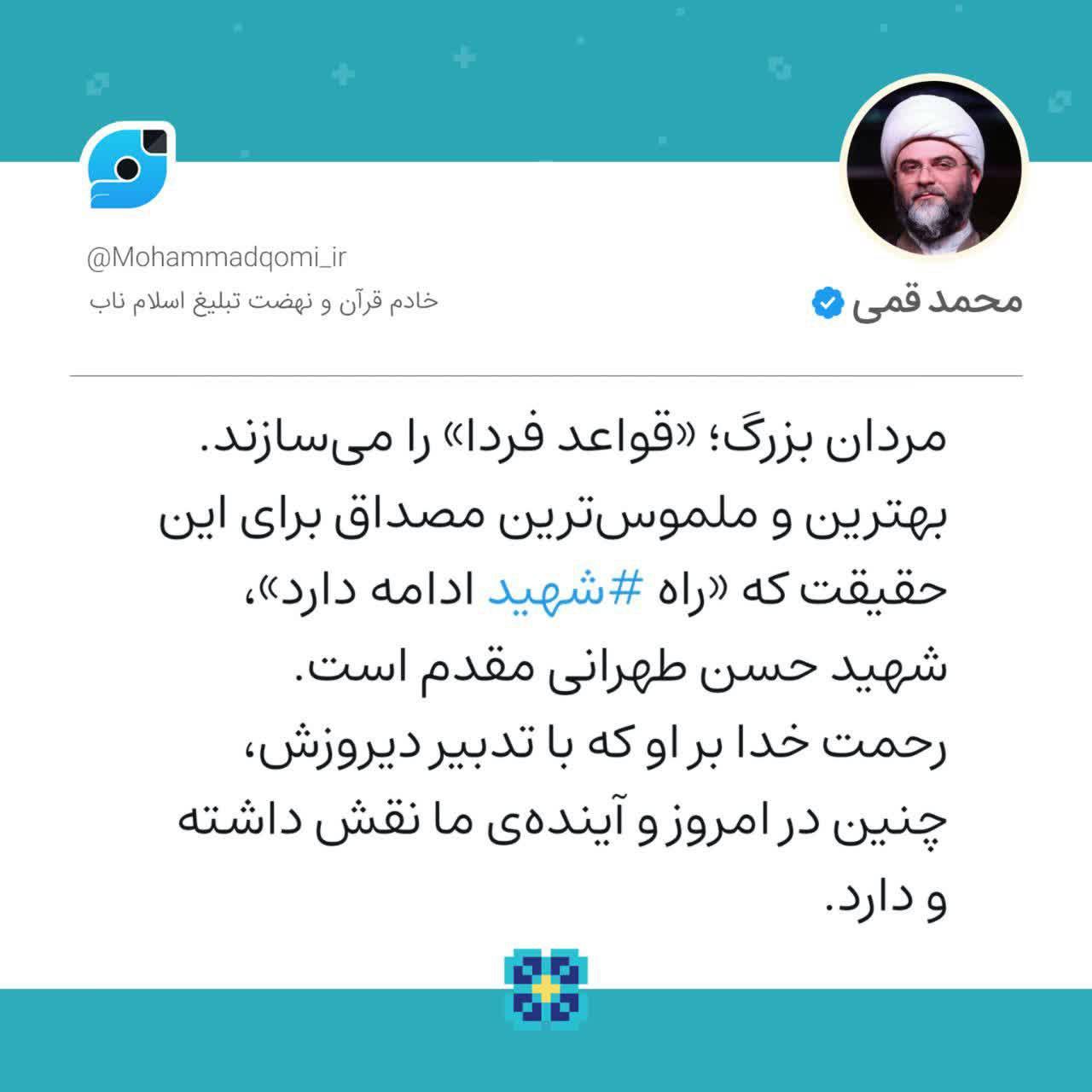به گزارش روابط عمومی سازمان تبلیغات اسلامی، حجت‌الاسلام محمد قمی، رئیس سازمان تبلیغات اسلامی در سالگرد شهادت شهید طهرانی مقدم، پدر موشکی ایران در صفحه شخصی خود در شبکه اجتماعی ویراستی نوشت؛