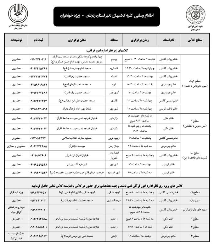 دورههای تدبر در قرآن کریم از برنامههای ابلاغی سازمان دارالقرآن الکریم به صورت حضوری در زنجان در حال برگزاری است. لیست جدید این کلاسها توسط اداره قرآنی منتشر شد.
