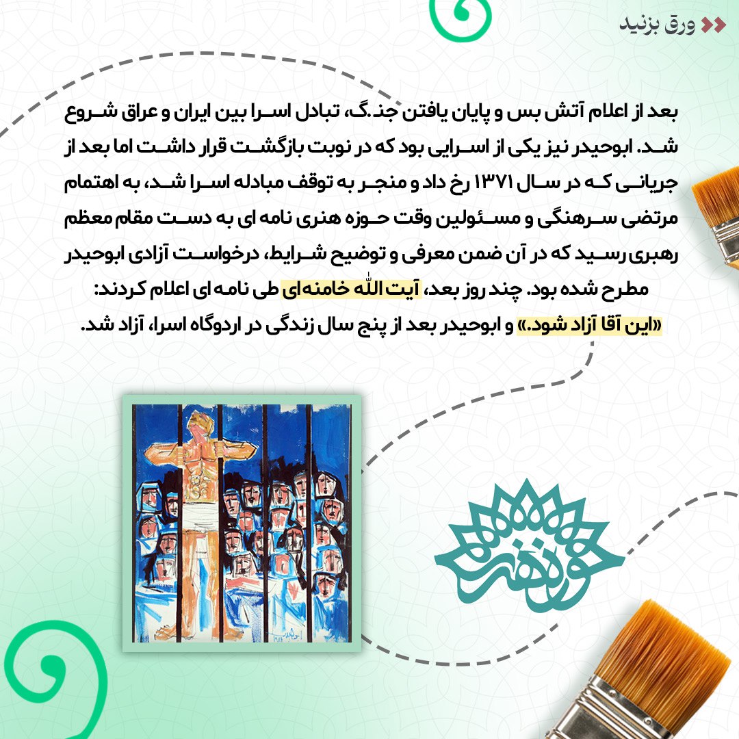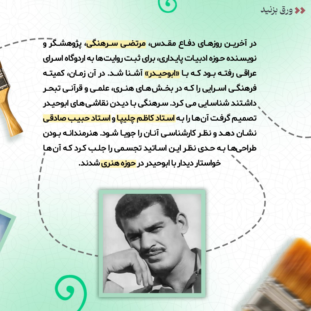 به گزارش روابط عمومی سازمان تبلیغات اسلامی، در آخرین روزهای دفاع مقدس، نقاش اسیری از اردوگاه اسرای عراقی تهران راهی حوزه هنری شد. هنرمندی که به خواست خود تسلیم نیروهای ایرانی شده بود و تا مدتی پس از آزادی نیز در ایران ماند. به مناسبت هفته دفاع مقدس، در این شماره از نشریه دیجیتال قصهی نقاش اسیری را مرور میکنیم که با دستور مستقیم رهبر انقلاب آزاد شد.