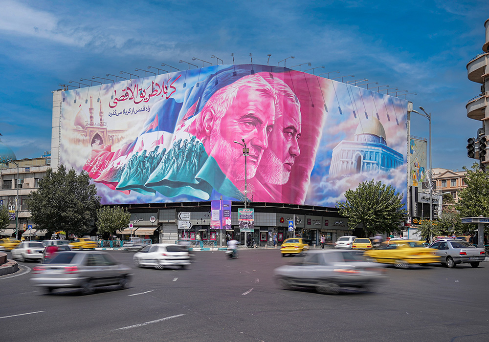 میدان انقلاب به عنوان یکی از مهمترین میادین تاریخی و فرهنگی تهران نیز همواره محل نمایش آثار هنری و تبلیغاتی با مضامین ملی و انقلابی بوده است. دیوارنگارههایی که در این میدان به نمایش درمیآیند، معمولاً با پیامهایی از استقامت، ایستادگی و حمایت از انقلاب اسلامی همراه هستند.یکی از برجستهترین دیوارنگارههای میدان انقلاب به مناسبت روز جهانی قدس طراحی شد. این دیوارنگاره شامل عکس صحنهپردازیشده «وارثین» بود که مجاهدت و فداکاری مردم مظلوم فلسطین را با حال و هوایی متفاوت روایت میکرد. این اثر هنری با تأکید بر روحیه مقاومت و پایداری مردم فلسطین، پیامهای عمیق انسانی و سیاسی را به مخاطبان منتقل کرد. دیوارنگاره روز جهانی قدس توانست در فضای مجازی نیز به سرعت منتشر شده و توجهات زیادی را به خود جلب کند.این نوع اکرانها با استفاده از عناصر بصری قوی و پیامهای واضح و تأثیرگذار، نه تنها به جذب مخاطبان داخلی کمک میکنند، بلکه در سطح بینالمللی نیز بازتاب دارند و موجب بحثهای مختلفی میشوند.