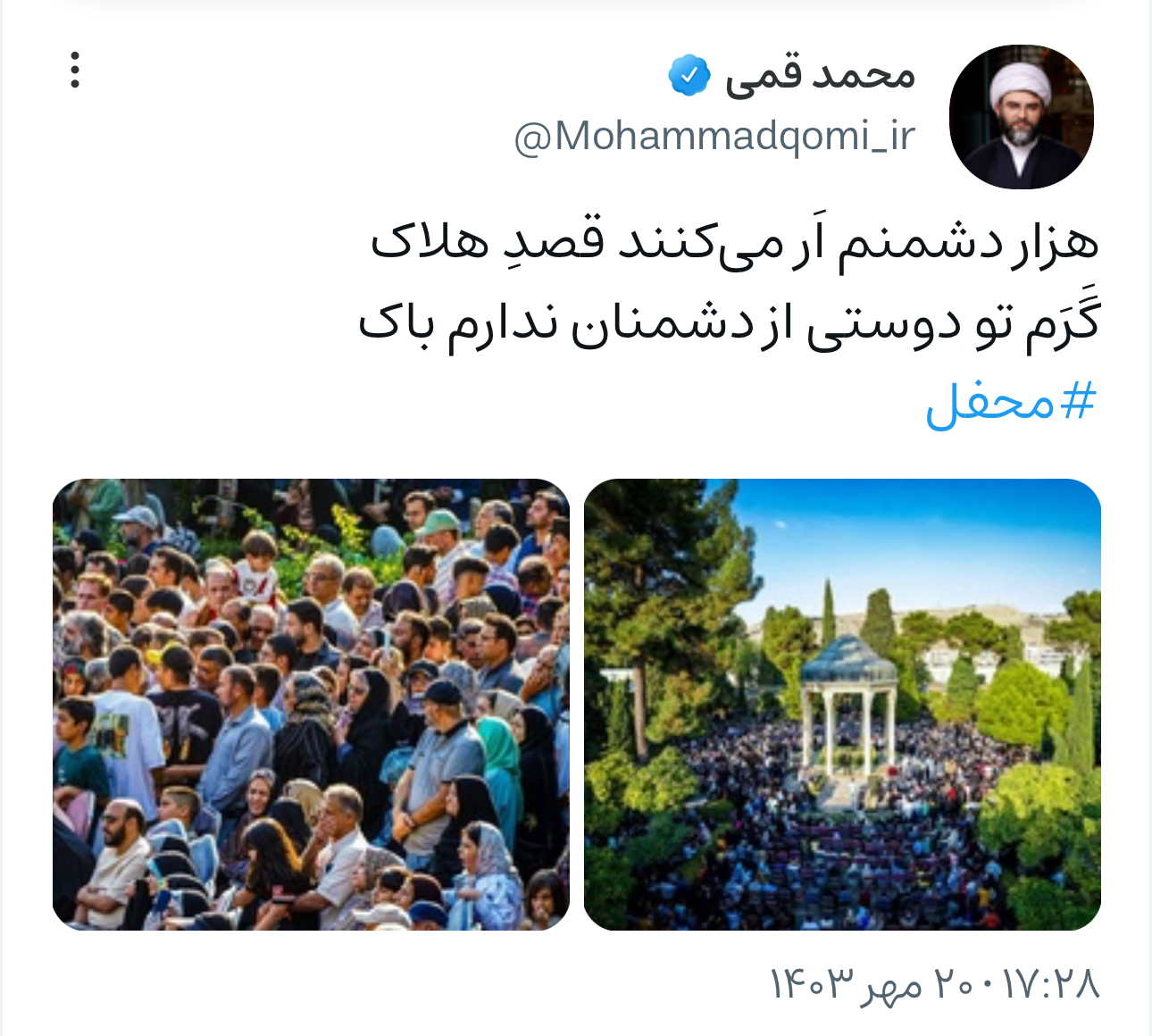 حجتالاسلام محمد قمی، همزمان با روز بزرگداشت حافظ، بیتی از لسانالغیب و تصویری از استقبال گسترده مردم شیراز از محفل قرآنی در صفحه شخصی خود در ويراستی منتشر کرد.