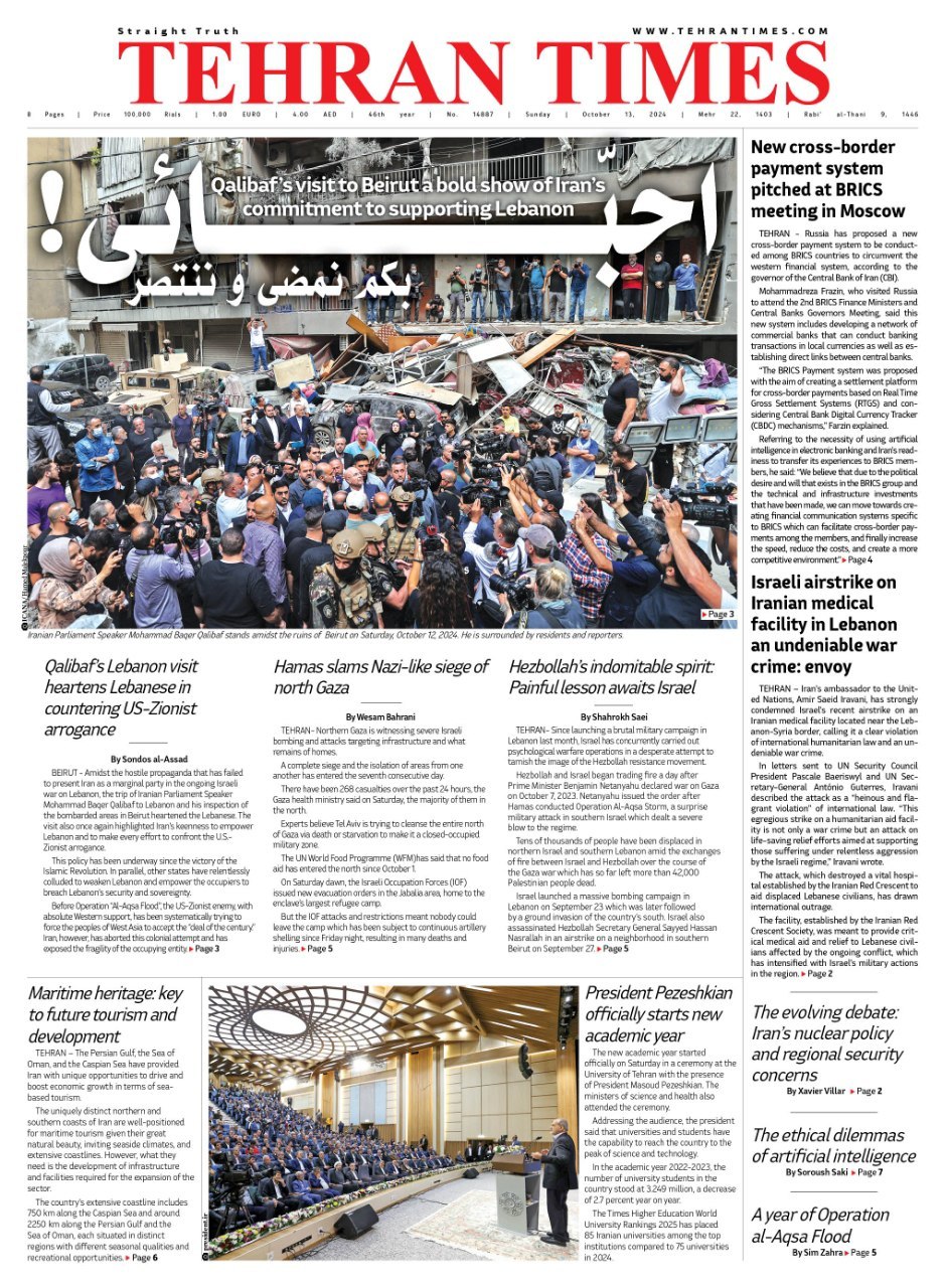 عبارت «احبائی! بِکُم نمضی و نَنتصِرُ»، (عزیزانم! با شما پیش میرویم و با شما پیروز میشویم)، كه روزنامه تهران تایمز آن را برای صفحه نخست روز يكشبنه 22 مهر1403 (13 اكتبر 2024) خود انتخاب كرده، جملهای آشنا از سید عزیز مقاومت است که از جنگ غرورآفرین ۳۳ روزه تا امروز در خاطر رزمندگان مقاومت مانده است.