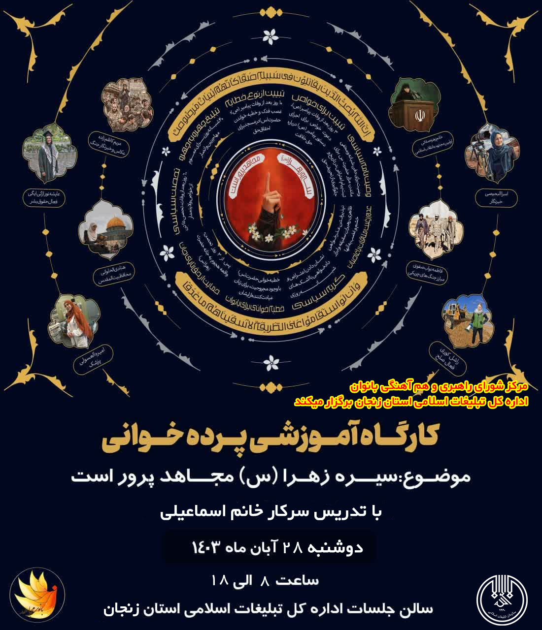 کارگاه آموزشی پرده خوانی با موضوع سیره زهرا (س) مجاهد پرور است به همت مرکز شورای راهبری و هم آهنگی بانوان اداره کل تبلیغات اسلامی استان زنجان برگزار می شود .