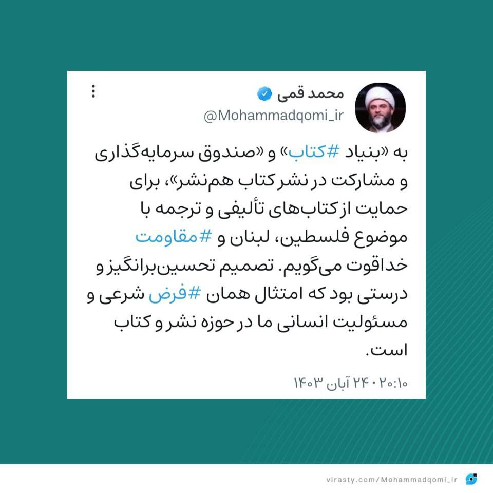 همزمان با روز کتاب، حجتالاسلام محمد قمی در صفحه شخصی خود در ویراستی از تصمیم بنیاد کتاب و صندوق همنشر تقدیر و تشکر کرد.