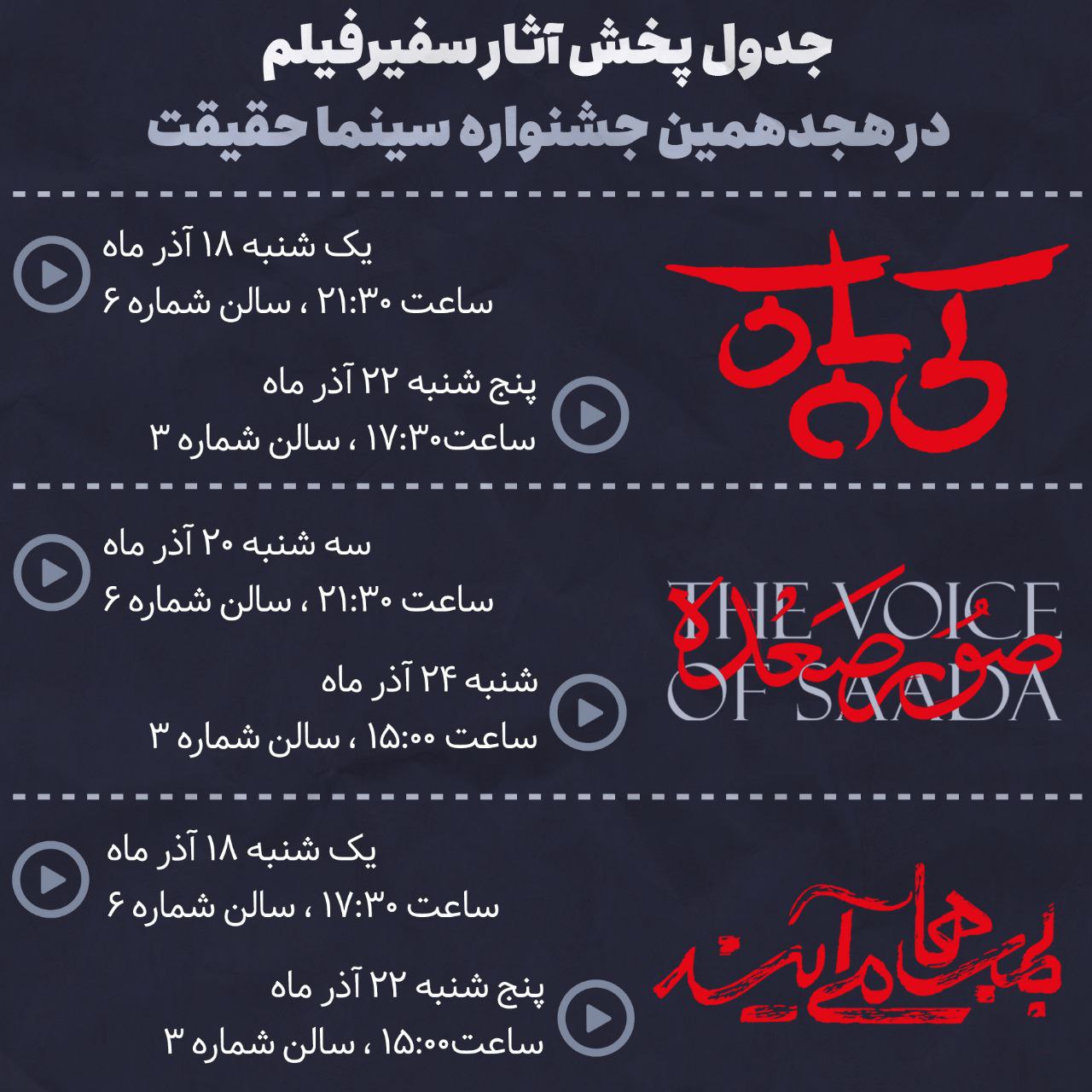 جدول نمایش و برنامههای هجدهمین جشنواره بینالمللی فیلم مستند ایران «سینماحقیقت» منتشر شد.