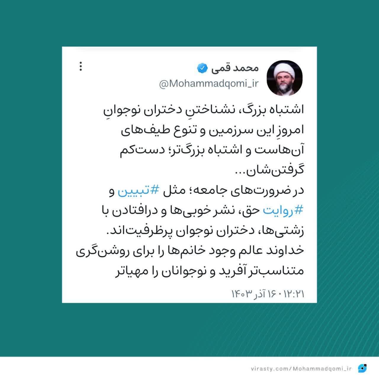 به گزارش روابط عمومی سازمان تبلیغات اسلامی، حجتالاسلام محمد قمی، رییس سازمان تبلیغات اسلامی در ایام شهادت حضرت فاطمه (س) متنی را در شبکه اجتماعی ویراستی منتشر کرد.