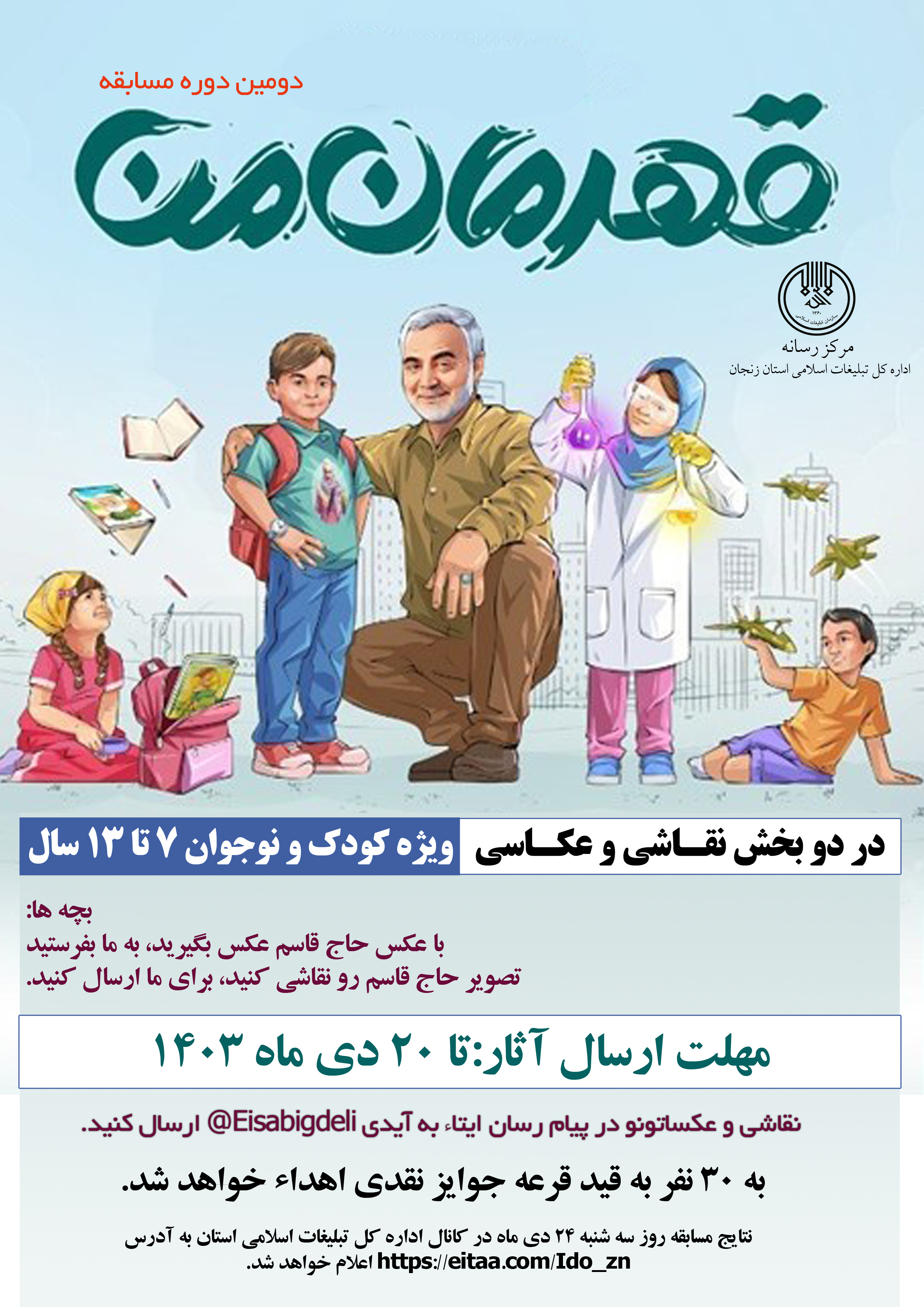 مرکز رسانه اداره کل تبلیغات اسلامی استان زنجان به مناسبت پنجمین سالگرد شهادت شهید سلیمانی دومین دوره مسابقه قهرمان من را برگزار میکند.