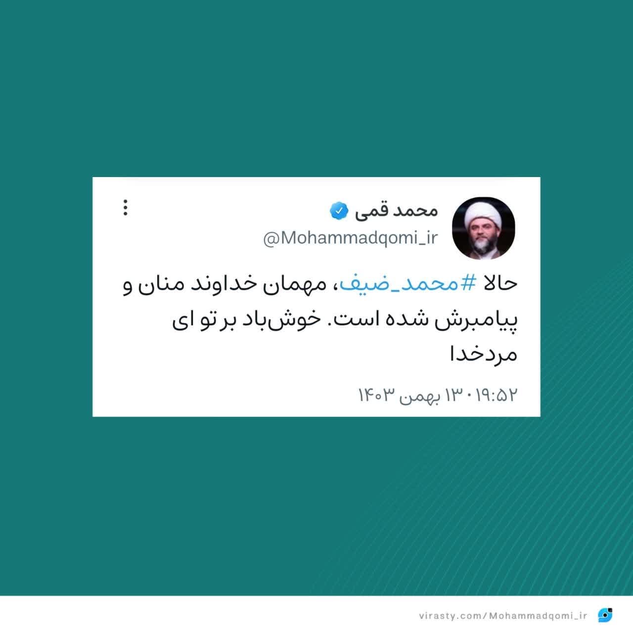 به گزارش روابط عمومی سازمان تبلیغات اسلامی، حجتالاسلام محمد قمی، رئیس سازمان تبلیغات اسلامی همزمان با اعلام خبر رسمی شهادت مجاهد سرافراز «محمد ضیف»، فرمانده گردانهای عزالدین قسام، شاخهٔ نظامی حماس، در ویراستی که در صفحه شخصی خود منتشر کرد از این شهید عزیز اسلام، به عنوان مهمان خدا یاد کرد.