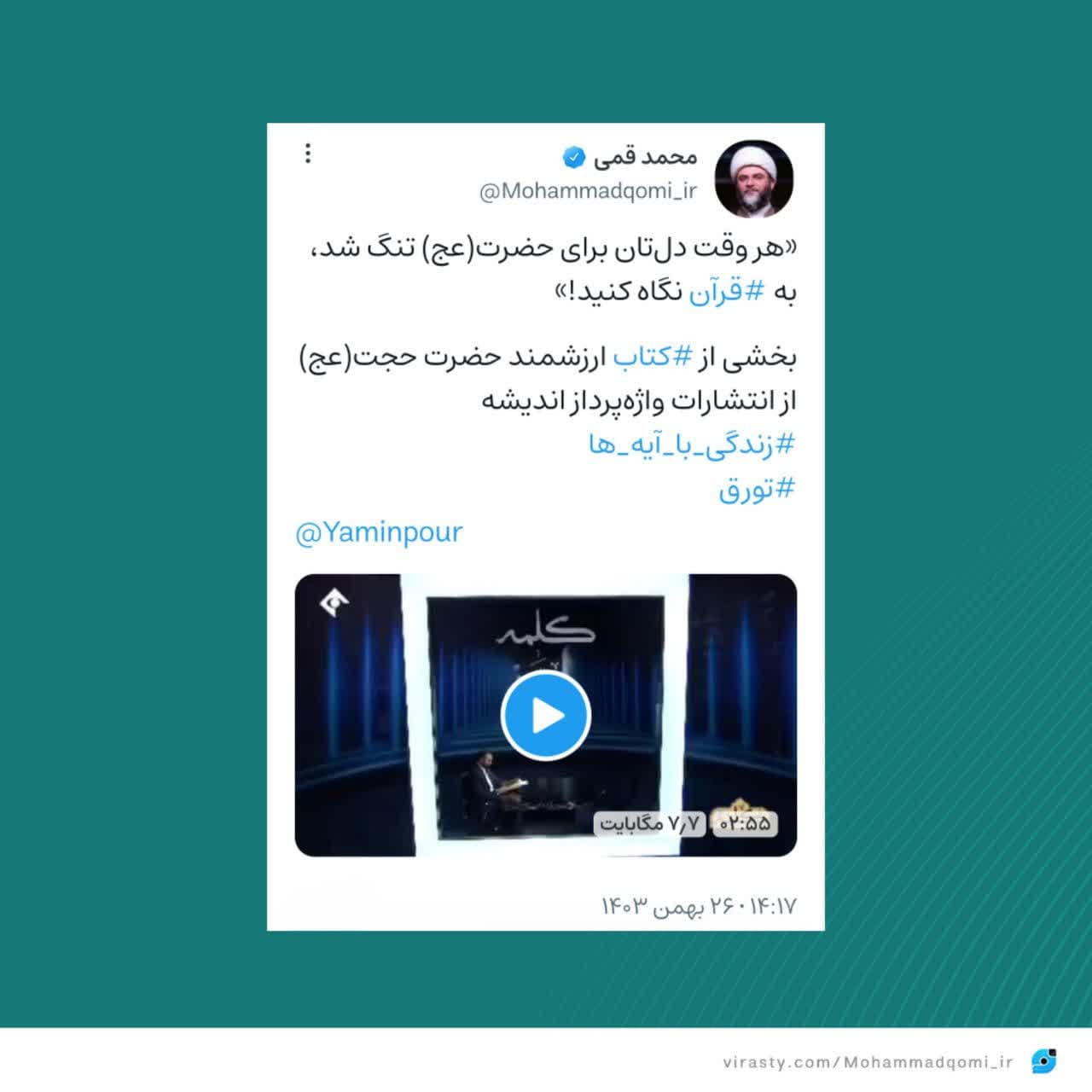 به گزارش روابط عمومی سازمان تبلیغات اسلامی، حجتالاسلام محمد قمی، رئیس سازمان تبلیغات اسلامی، همزمان با سال روز پرخیر و برکت ولادت حجت خدا و امام حاضر در نیمه شعبان المعظم، بخشی از کتاب شریف حضرت حجت(عج) را به صورت ویدئو در صفحه شخصی خود در شبکه اجتماعی ویراستی منتشر کرد.