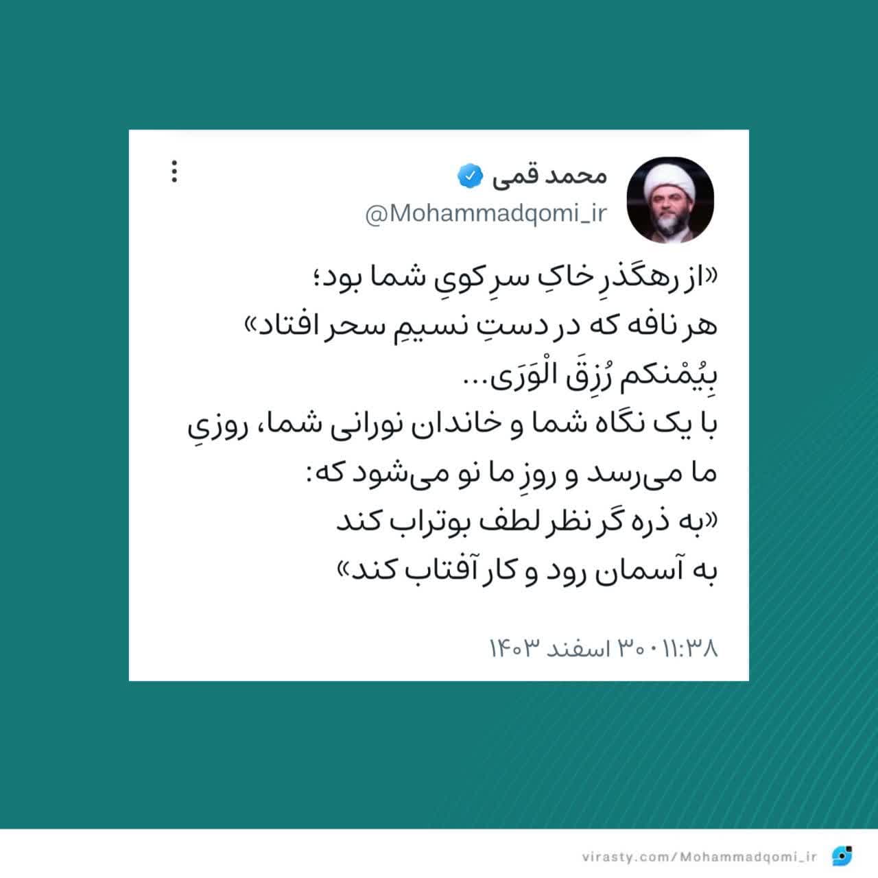 به گزارش روابط عمومی سازمان تبلیغات اسلامی، حجتالاسلام محمد قمی، رئیس سازمان تبلیغات اسلامی در آستانه تحویل سال نو متنی در شبکه اجتماعی ویراستی منتشر کرد.