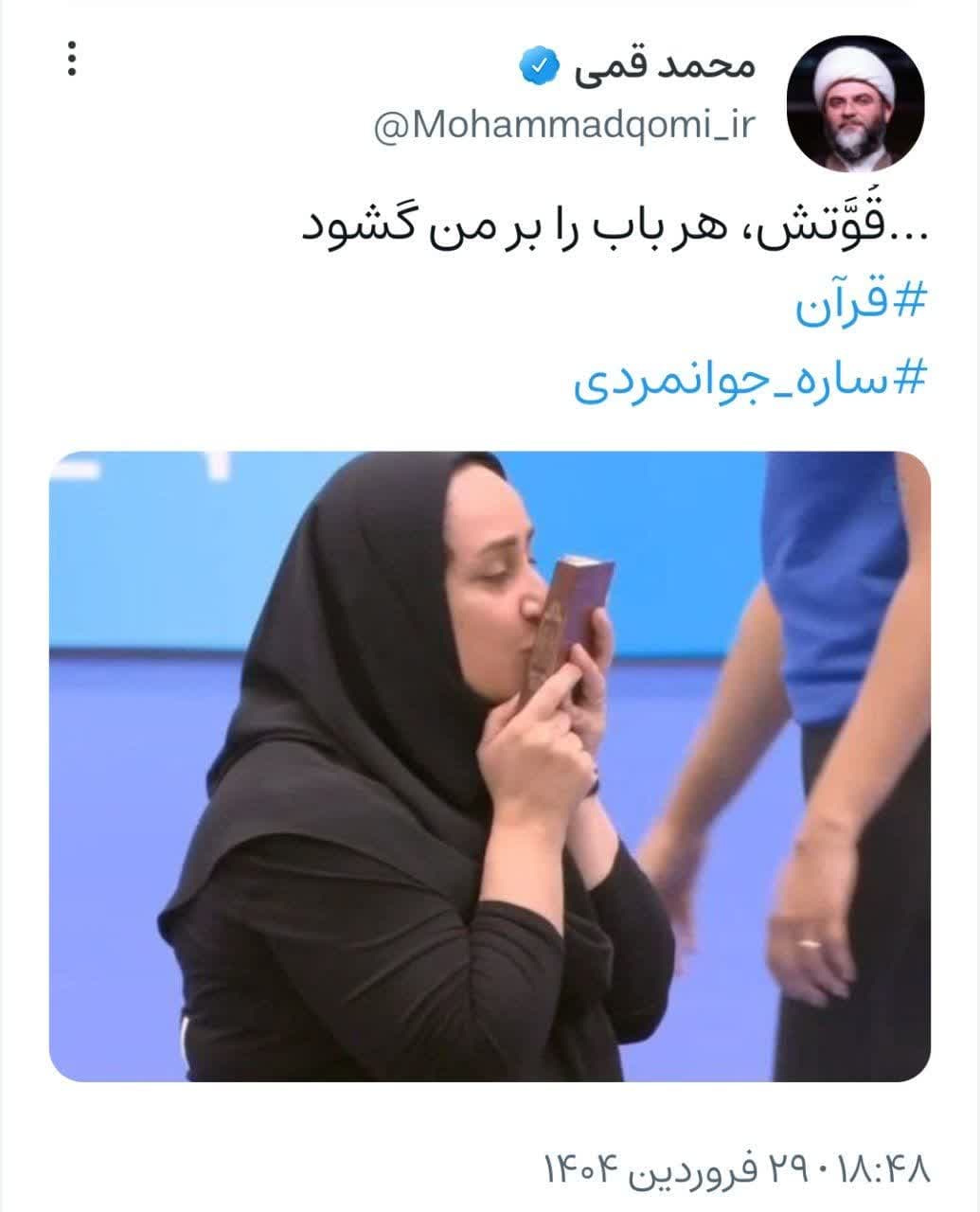 به گزارش روابط عمومی سازمان تبلیغات اسلامی، حجتالاسلام محمد قمی، رئیس سازمان تبلیغات اسلامی با انتشار عکسی از ساره جوانمردی، قهرمان پاراالمپیک کشورمان پس از مسابقات که در حال بوسیدن قرآن کریم بود نوشت؛ قوتش، هر باب را بر من گشود.