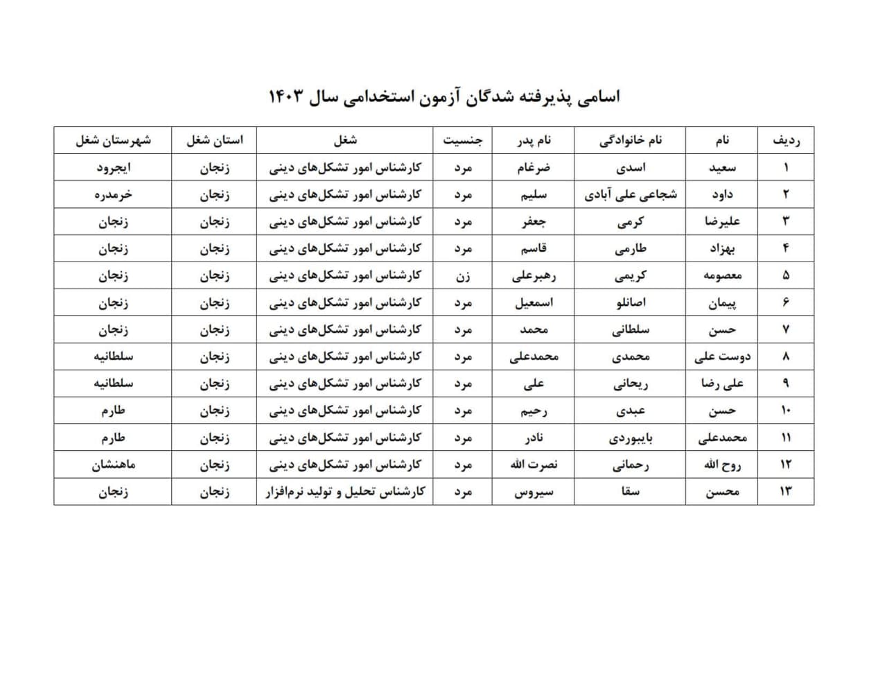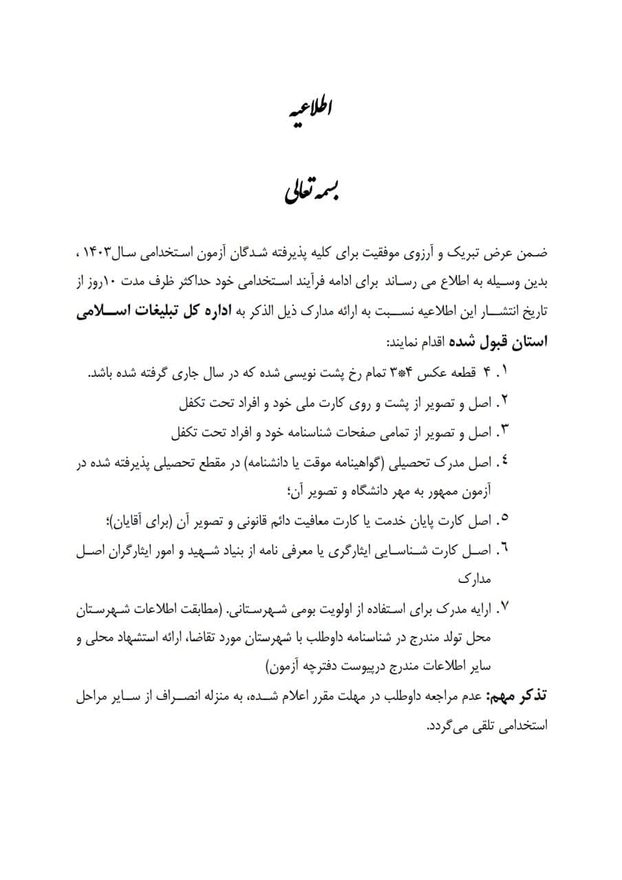 بدینوسیله به اطلاع می رساند برای ادامه فرایند استخدامی خود حداکثر ظرف مدت 7روز از تاریخ انتشار این اطلاعیه که در گروه قرار داده خواهد شد ( حداکثر تا ۴ شهریور ماه) نسبت به ارائه مدارک اعلام شده به اداره کل تبلیغات اسلامی استان زنجان اقدام نمایند.